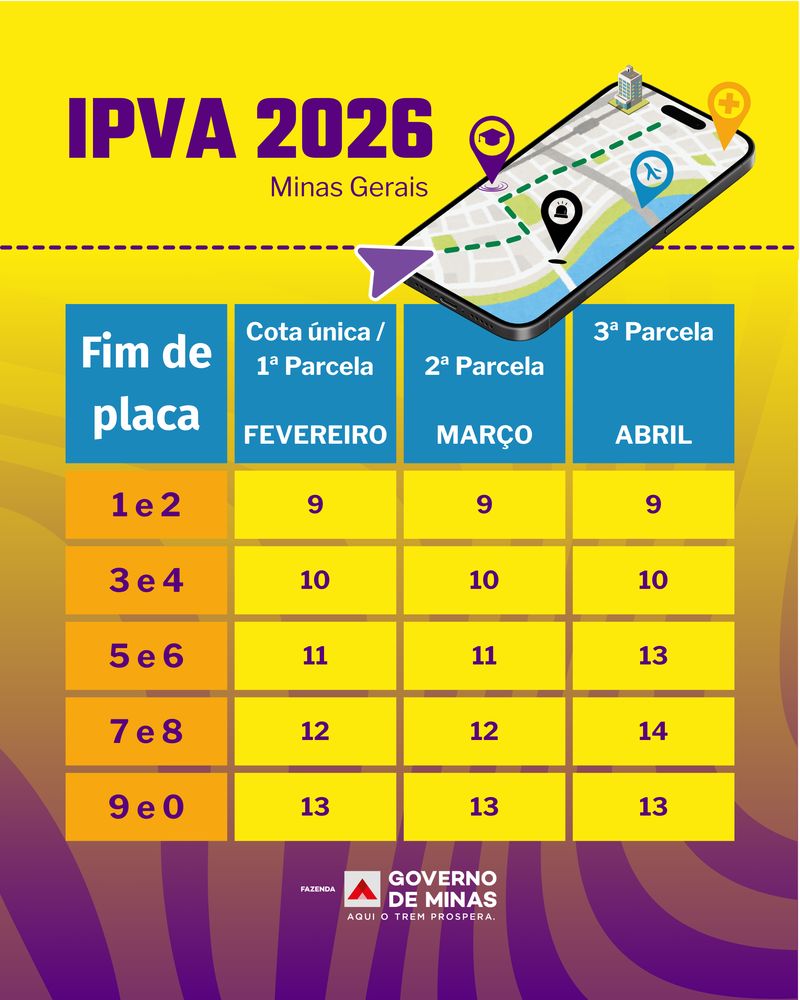 O calendário de pagamento começa em fevereiro de 2026. O imposto poderá ser quitado em cota única, com desconto de 3%, ou dividido em três parcelas, com vencimentos em fevereiro, março e abril. Já a Taxa de Renovação do Licenciamento Anual de Veículo (TRLAV), no valor de R$ 35,62, vence no dia 31 de março. Quem desejar antecipar os pagamentos poderá fazê-lo a partir de 2 de janeiro de 2026.
